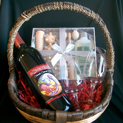Bonacquisti Wine Company presents the Perfect Night In gift basket. A bottle of Cabernet Franc or Syrah, 2 wine glasses, a total body massage kit (includes Massage Oil, Hand Pressure Massager, Multi-pressure Massager and Body Roller Massager) and chocolate from Wen Chocolates for $59.95. Guys, keep the women happy and you'll go places.